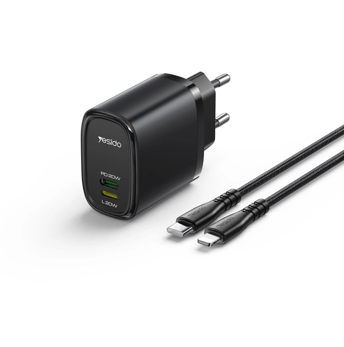 Yesido YC44 Type-C + Lightning Dual Ports 20W Fast Charging Euro Gauge Travel Charger With C To L Cable.