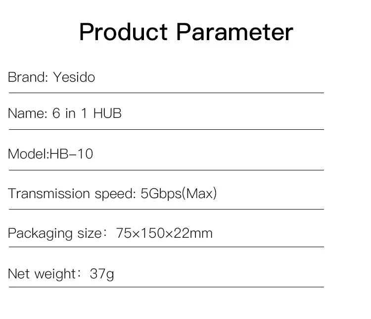 | Model | HB10 6 in 1 USB Hub Adapter |