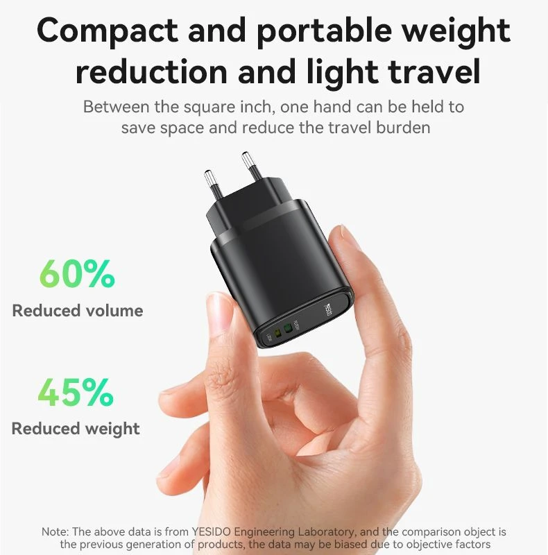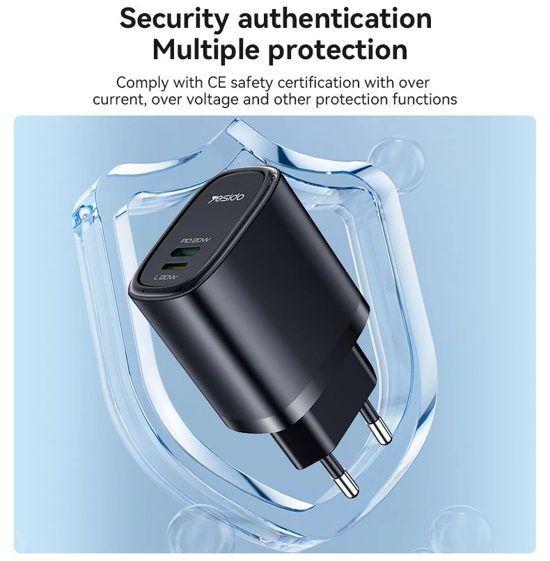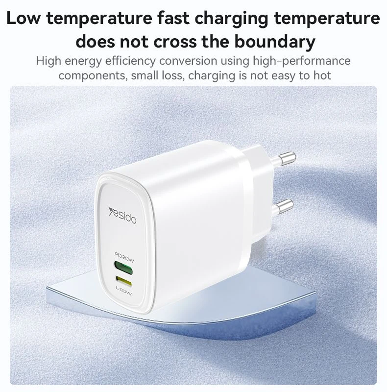 Yesido YC44 Type-C + Lightning Dual Ports 20W Fast Charging Euro Gauge Travel Charger With C To L Cable.